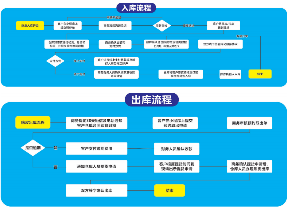 通过三套系统实现陈皮入库出库智能化管理,实现作业机械化、智能化,全方位监控,可追溯且高效精准;开发手机端小程序,让客户实时调看陈皮状况。