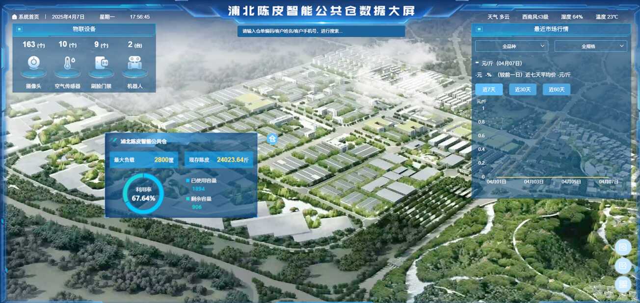 公共仓建筑面积2000平方米,分为后台控制区、展示区、出入库处理区和仓储区,可存放20吨陈皮。配套有163个高清摄像头、10个空气传感器、9个刷脸门禁,配备2台智能机器人。对仓库进行全方位监控、数据监测、人员进出管理和货物搬运,实现仓储信息全程透明、可追溯。