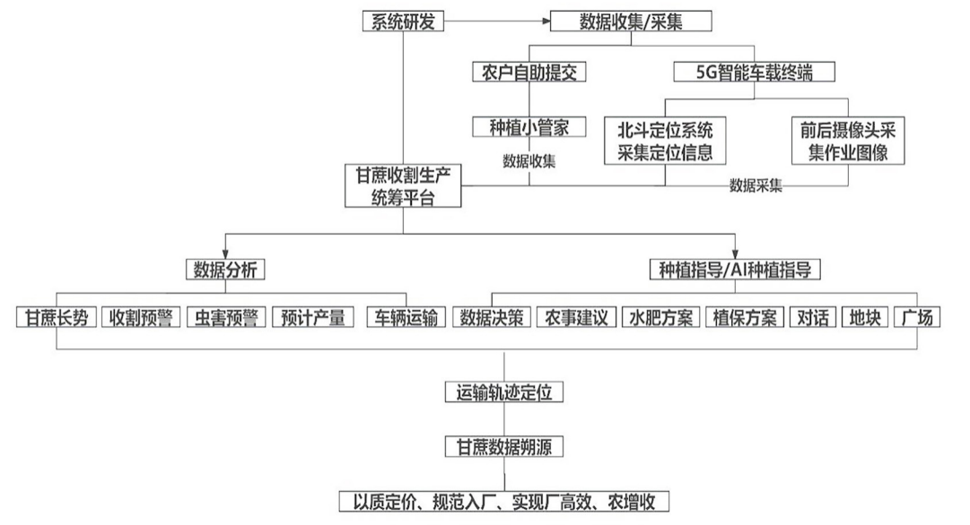 前期以甘蔗整秆智能收割服务订单为核心,协同管控生产全过程;组建专业服务队降低运营成本;搭建免费大数据平台,后期依据流量收取服务费用,保障平台可持续运营,推动甘蔗生产模式革新与产业升级。